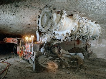 The picture on the left and the picture below show two different views of an underground operating longwall system. It is comprised of a shear that moves back and forth along a pan line that can be several hundred feet long. It can mine greater amounts of coal in less time.